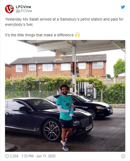 ตัวรุกกลุ่มชาติอียิปต์ สวมชุดฝึกซ้อมของ “ลิเวอร์พูล” ขับขี่รถเข้าปั๊มเติมน้ำมันเมื่อวันพุธก่อนหน้านี้ ก่อนสร้างความตรึงใจให้กับผู้คน แล้วก็มีการแชร์กันเป็นอย่างมากในโลกอินเตอร์เน็ต ข้างหลังเจ้าตัวใจป้ำควักกระเป๋าจ่ายค่าน้ำประปามันให้กับทุกคนในปั๊ม